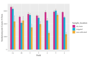 - Identify soil management strategies that enhance fruit yield and quality, and evaluate their profitability. Because high nutrient concentrations can limit plant-fungi associations, we tracked soil nutrient levels (nitrogen and phosphorus, both available and total) to pair with fungal and harvest data. Of particular interest is nutrient depth, as some farmers go to great lengths to deliver nutrients deeper into the soil profile in dry farm systems. Also of interest is field history—i.e., number of years since most recent irrigation—as previously dry soils may prime native beneficial microbial communities. We will identify the soil management strategies (inoculation, nutrient depth, etc.) that show the strongest yield/quality improvements, and compare farm revenue generated by each practice to expected management costs to determine profitability.