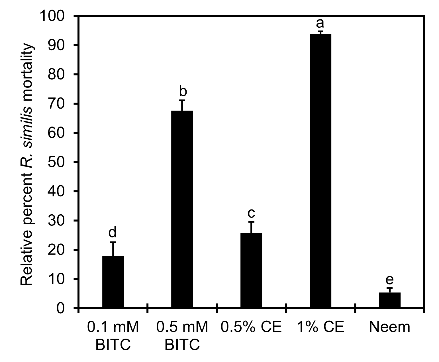 Toxicities of PGS CE and BITC to vermiform stages of R. similis were tested in 50-mL beakers in the laboratory. Pure, synthetic BITC from Sigma-Aldrich (Merck KGAaA, Darmstadt, Germany) was dissolved in dimethylsulfoxide (DMSO) with 15 mL sterile water to prepare 0.5 mM or 0.1 mM BITC. Papaya ground seed crude extract 2% stock solution was prepared, and diluted with sterile water to 1.0% or 0.5% in 15-mL final volume. AzaGuard® (a.i. 3% azadirachtin, BioSafe Systems, East Hartford, Connecticut) at 2 µl/ml was included as a reference control (labeled as Neem). Sterile water was included as the untreated control. Each treatment was replicated in 4 beakers, with 100 vermiform stages of R. similis added per beaker. Thus, a total of 24 beakers with 6 treatments (0.5 mM BITC, 0.1 mM BITC, 1% PGS CE, 0.5% PGS CE, 0.2% AzaGuard® and untreated control) were covered with parafilm and incubated at room temperature (23°C) for 24 hours in a hood. Proportions of dead (straight and unmoving when poked) versus live nematodes were then counted under a Leica DM1L inverted microscope to determine % mortality. To factor out nematostatic effects, counted samples were then rinsed with water on a 20-um-mesh sieve and transferred into clean beakers, each with no more than 20 mL water. Beakers were parafilmed and incubated again at room temperature (23°C) for 24 hours. At 48 hours, counting was repeated as previously described.