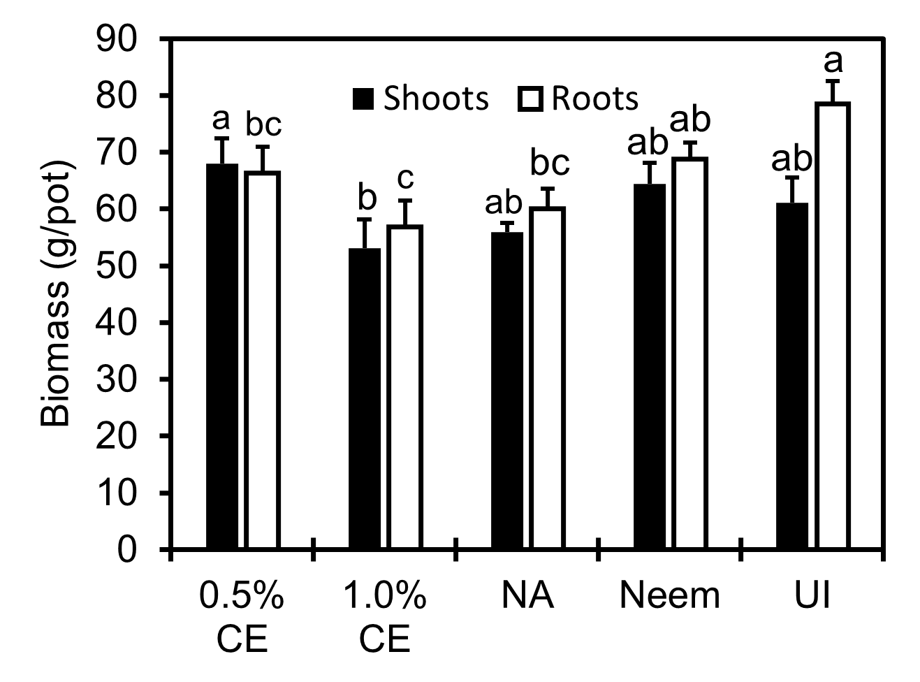 Shoot and root biomass in 1% PGS CE-treated pots was lower than that in the 0.5% PGS CE treatment, and numerically lower than NA (P > 0.05, Fig. 17). While shoot biomass in all treatments was not different from the uninoculated (UI) control, NA, 0.5% and 1.0% CE resulted in lower root biomass than UI (P ≤ 0.05). While no significant difference in shoot and root biomass was observed between Neem and NA, Neem treatment maintained a similar level of shoot and root biomass as well as numbers of flowers, leaves and plant height as the UI (Fig.16 and 17).