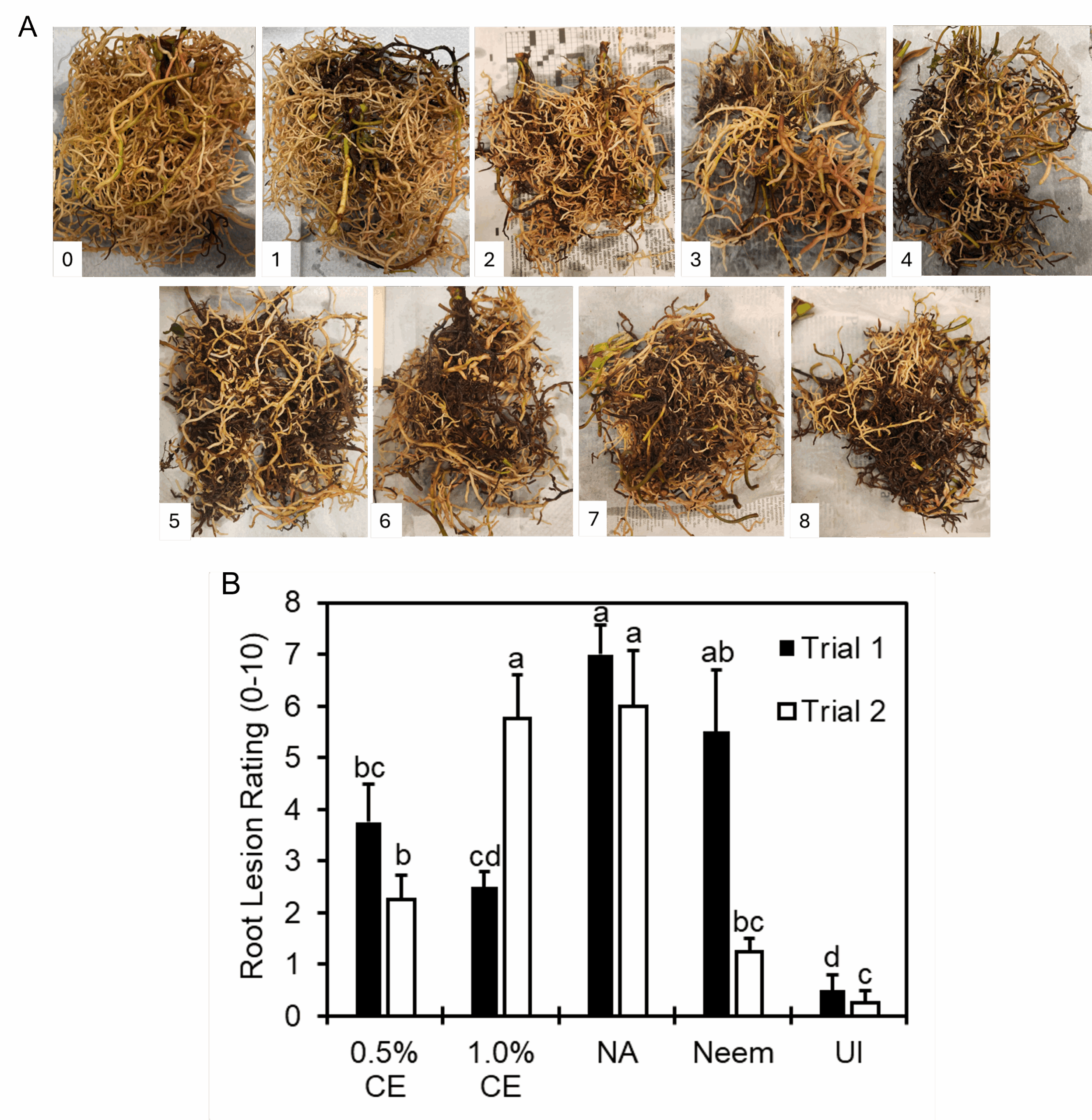 Effects of PGS CE biofumigation on root lesion caused by R. similis: Image of root lesion rating caused by R. similis from 0-8 were shown in Fig 18A. No rating 9-10 were observed in this experiment. Since significant interaction between trial and treatment effects occurred, data were presented by trial for this parameter. In both trials, 0.5% PGS CE reduced root lesion damage compared to NA (no application) consistently, whereas performance of 1% PGS CE on root lesion was inconsistent, where it had significantly less root lesion damage than NA in Trial 1 but not in Trial 2 (Fig. 18). Inversely, Neem-treated roots had root lesion damage comparable to NA in Trial 1, but significantly less root damage than NA in Trial 2 (Fig. 18).