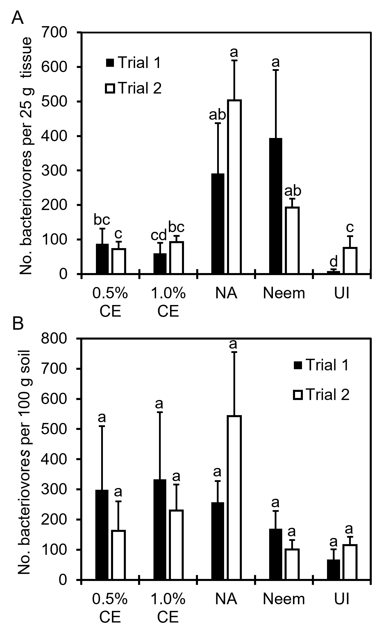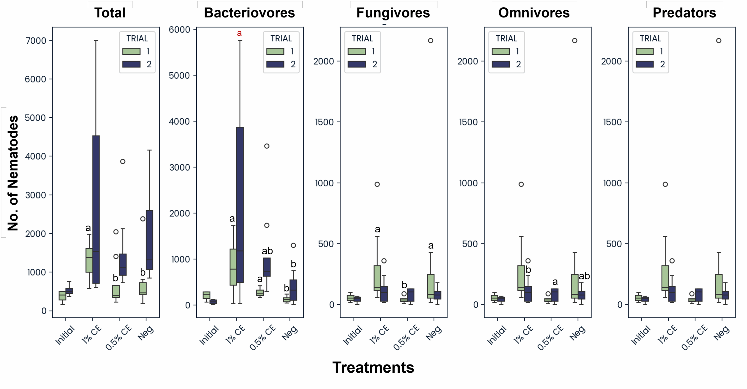 Across treatments and trials, the total abundance of free-living fungivore, omnivore, and predator nematodes were mostly comparable and unchanging, except for Trial 1 fungivores, in which significantly higher fungivores were present in the 1% CE and NA treatments versus 0.5% CE treated pots (Fig. 30). Trial 1 data also showed a significant increase in bacteriovore nematode populations as with pots treated with CE, with 1% CE having the highest difference. This was likely due to the PGS debris being added to the pots post-drenching, which provided an organic material source for bacteria to colonize during the decomposition process, leading to a larger available food source for bacterial-feeding nematodes. While not statistically significant (p≥0.05), bacterivore populations in Trial 2 also followed the same trend (Fig. 30).