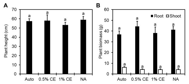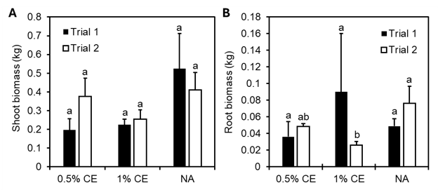 Final plant height as well as the root and shoot biomass recorded demonstrated similar results across treatment groups, with no significant changes observed (Fig.22). However, there was a small numerical increase (p>0.05) in the average root mass in NA and 0.5% CE treated pots compared to Auto and 1% CE treated pots in Trial 1 (Fig. 22B).