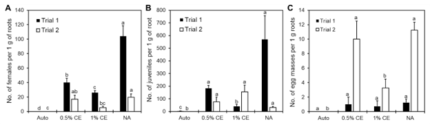 Notably, in Trial 1, NA and 0.5% CE treated pots also had significantly higher numbers of M. incognita adult females within the roots, with NA having the highest number out of all treatments (Fig. 23A). With a higher population of female root-knot nematodes (RKN) present, higher gall formation was likely starting to occur, which can cause an increase in root weight as well. While the differences in number of females was not significant (p>0.05) in Trial 2, data collected still followed the same numerical trend observed in Trial 1, with NA and 0.5% CE treated plants having higher female RKN counts (Fig. 23A).