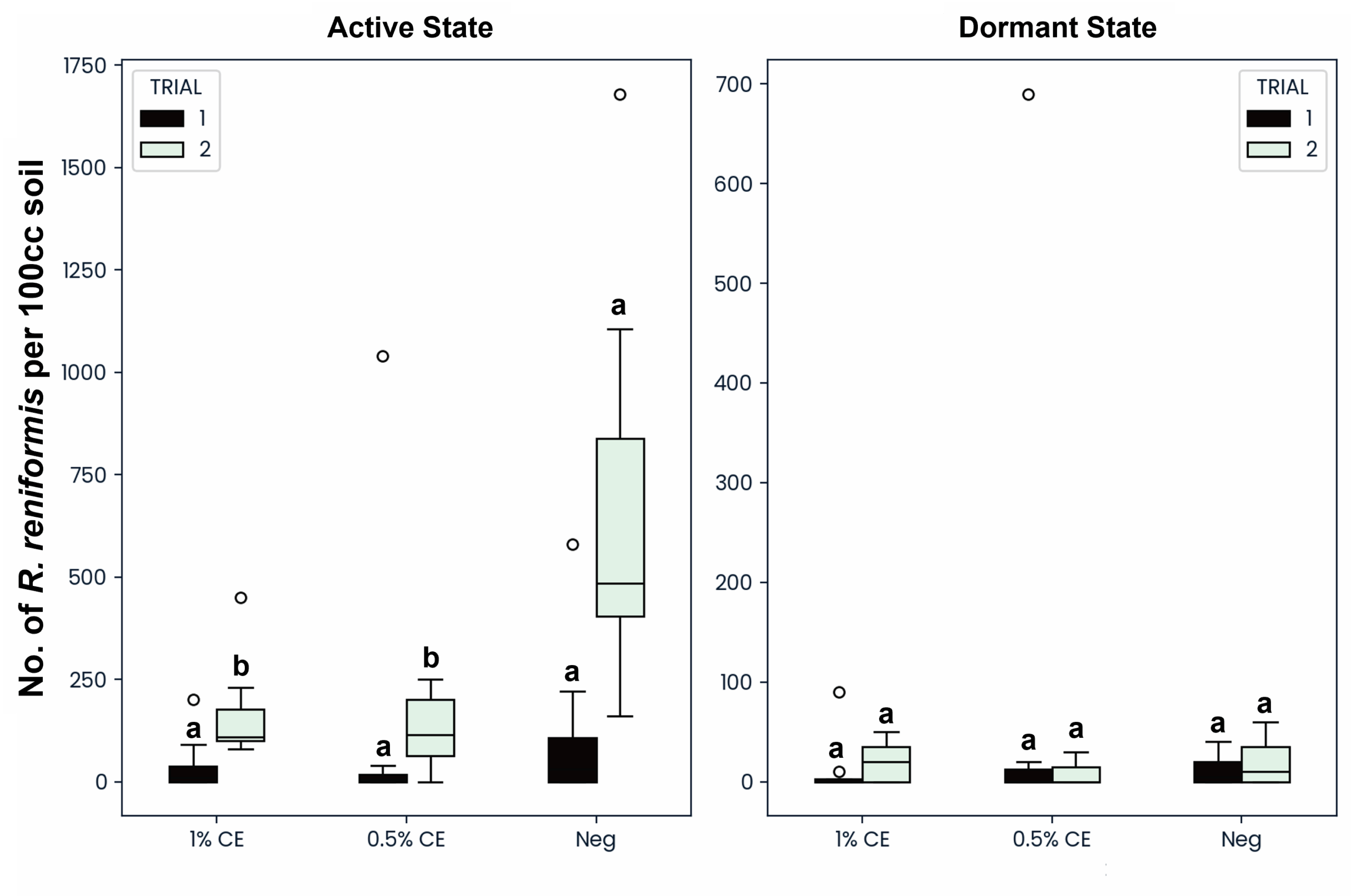 To determine if PGS CE drenching would be effective against both the active and dormant (anhydrobiotic) states of reniform nematodes, both states were counted and recorded separately. When treated with PGS CE at either 0.5% or 1% PGS CE, the active state of reniform was significantly reduced compared to NA treated pots, however no difference or decrease was seen in the number of dormant anhydrobiotic reniform (Fig. 28). This suggests that the BITC from PGS CE is unable to penetrate and kill reniform nematodes in their survival state.