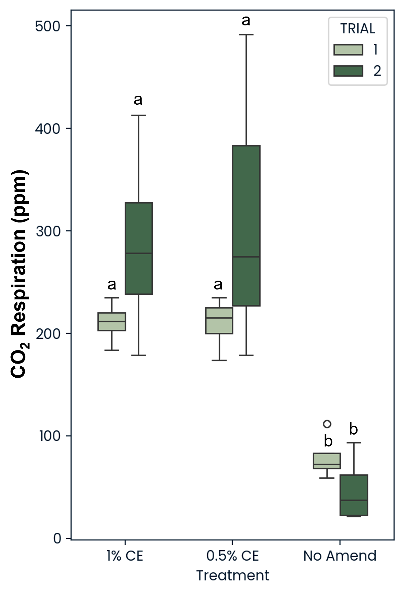 Across trials, both 0.5% and 1% CE saw a significant (p<0.05) increase in CO2 ppm present in the soil compared to the NA treated replicates (Fig. 29). This suggests that the use of PGS CE also increased soil microbial respiration.
