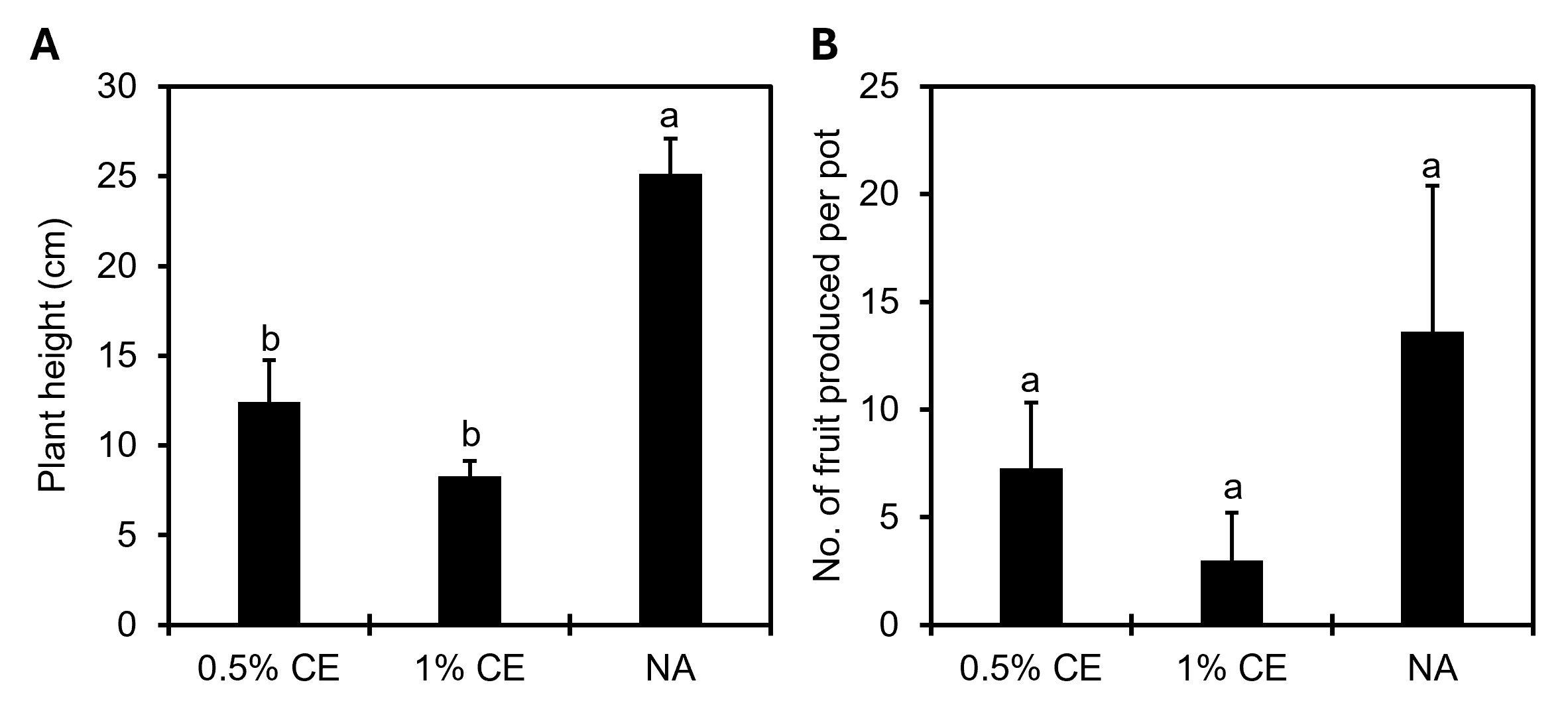 For overall plant growth, there was a significant (p<0.05) negative difference measure in plant height in field pots treated with PGS CE versus NA treated pots (Fig. 24A), and while not significant (p≥0.05), there was a numerical decrease in the number of fruits produced when using PGS CE versus without (Fig. 24B).