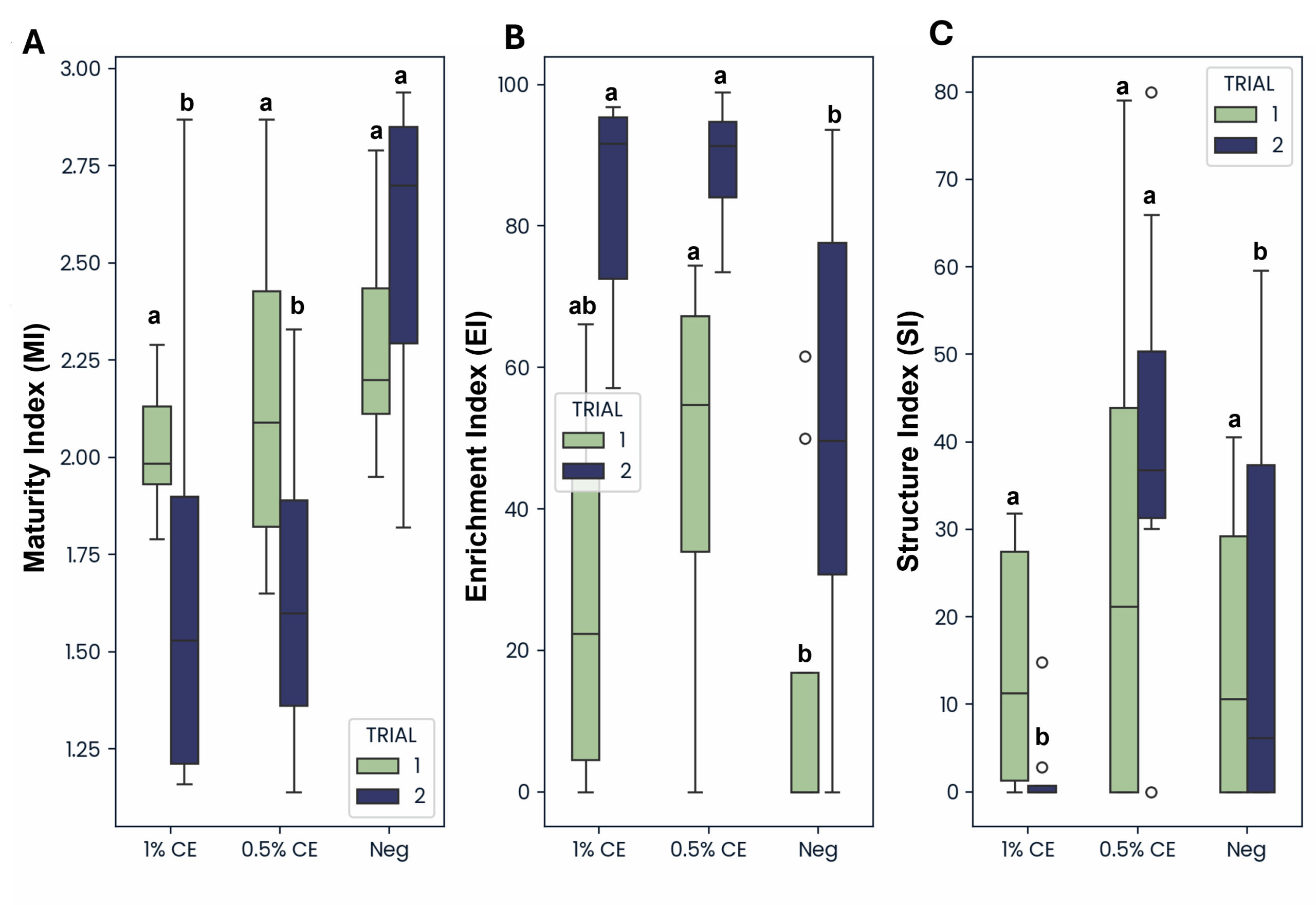 The enrichment index (EI) (characterized based on the presence of opportunistic bacterial and fungal feeding nematodes), was greater in both 0.5% and 1% CE treated groups compared to NA across both trials (Fig. 32), indicating that drenching with PGS CE is boosting microbial activity in the soil.