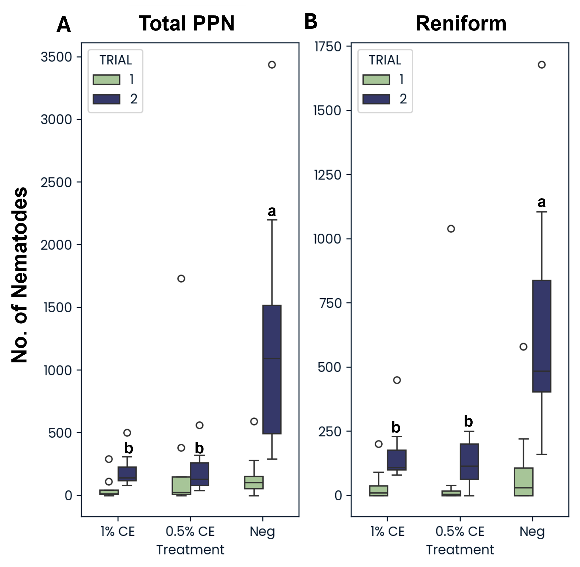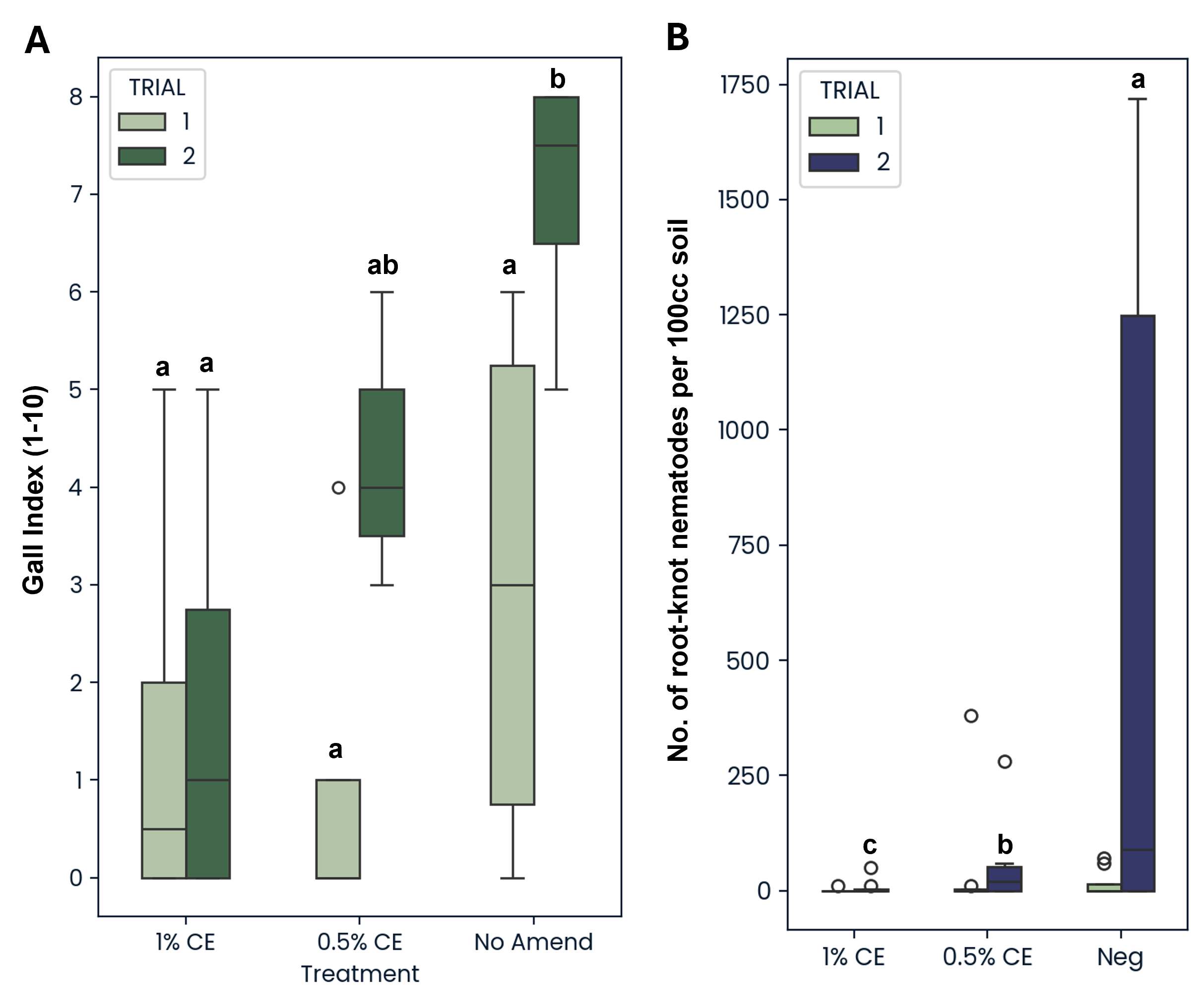The greater root mass observed in Trial 2 NA treatments appeared to correspond with an increase in root-knot galls found on NA-treated plant roots in the Trial 2 as well (Fig. 26A). Additionally, when looking at the number of root-knot nematodes (RKN) found in the soil, NA treatment also led to significantly greater RKN population numbers compared to both PGS CE concentrations (Fig. 26B). While population differences were not significant in Trial 1 due to a much lower starting population of RKN present in the soil in Trial 1 (Pi=37) compared to Trial 2 (Pi=402), the same population trend was still observed (Fig. 26B).