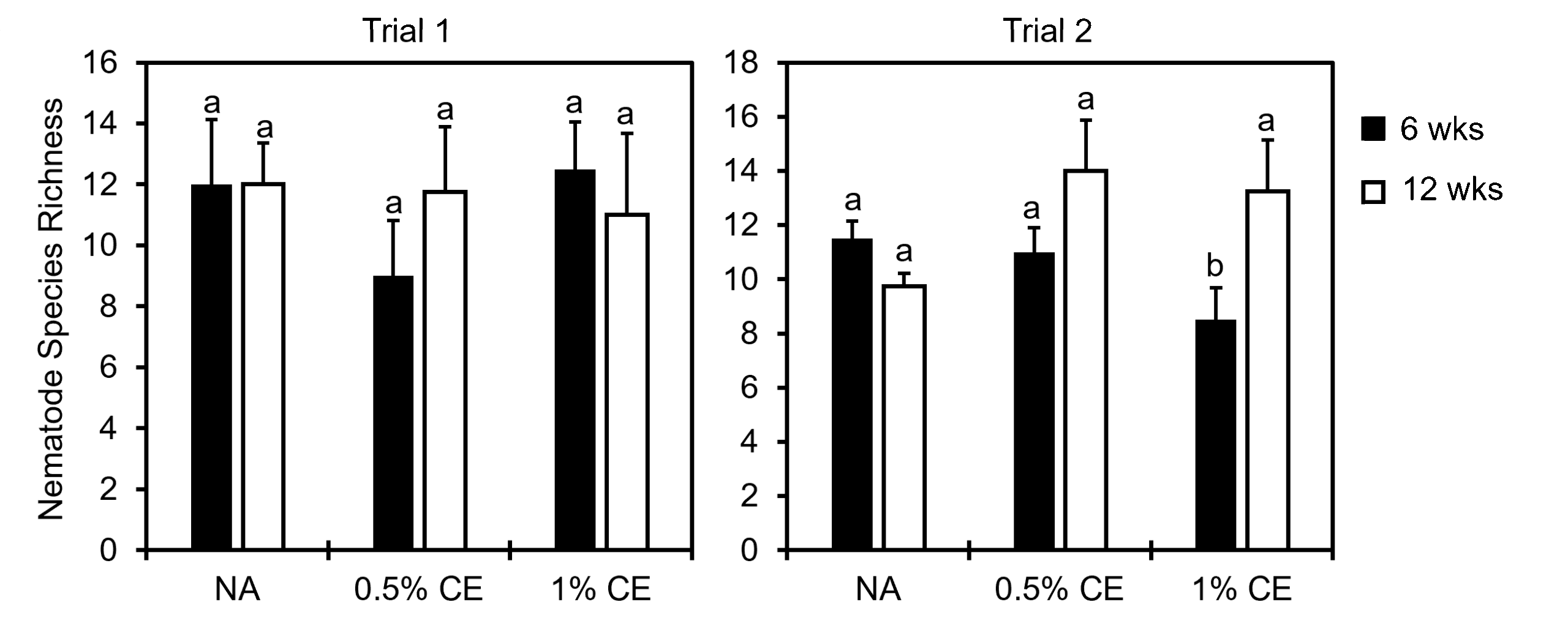 When looking at nematode community indices, there was a significant decrease in the nematode richness index observed in 1% CE treated pots at 6 weeks compared to NA and 0.5% CE treated pots, however at 12 weeks nematode richness recovered (Fig. 31). This suggests that the higher concentration of CE used may have been nematidical to other free-living nematodes present at first, but that due to added organic matter (PGS debris), the nematode community richness level was able to recover quickly compared to NA treatments.