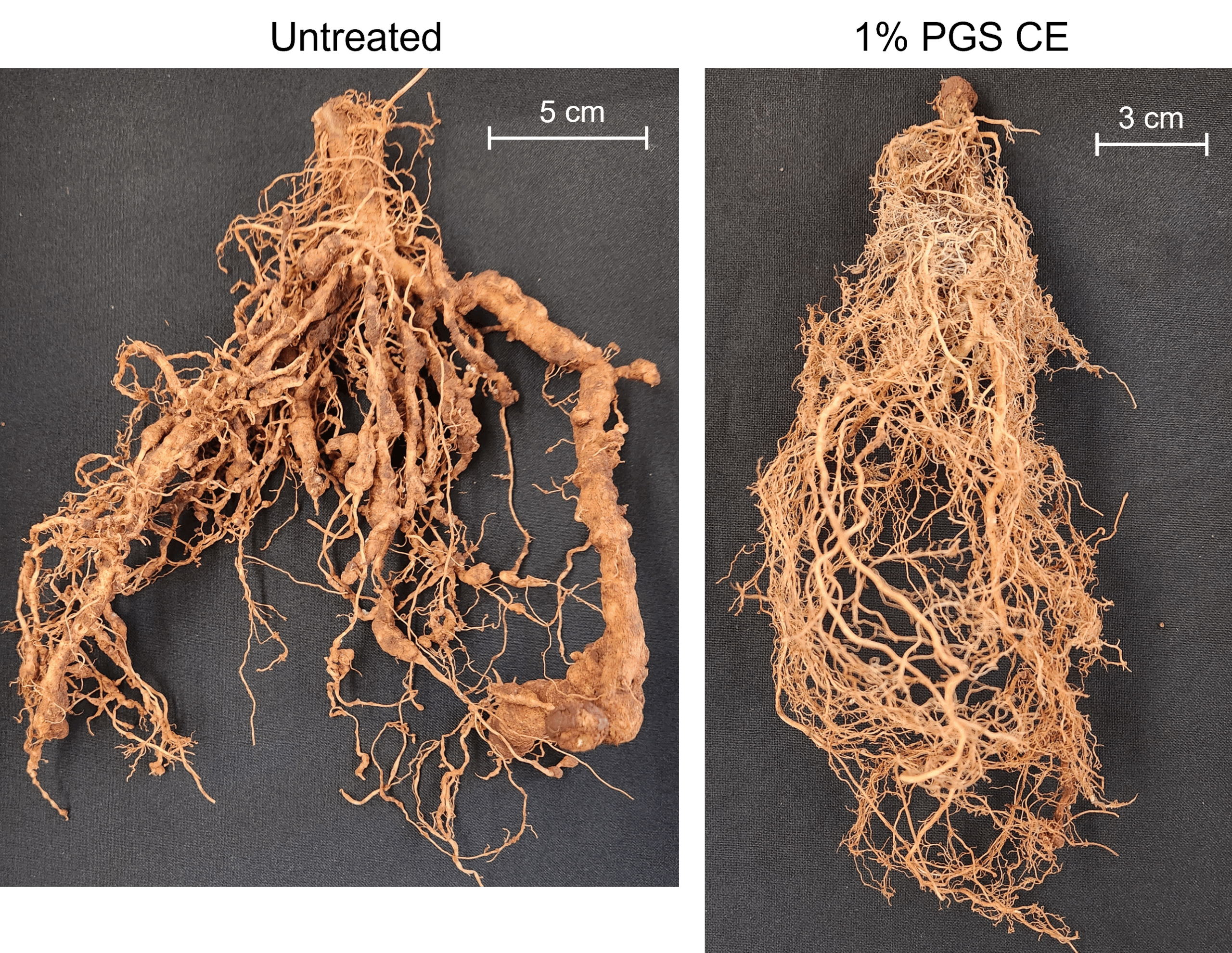 Similarly, the total populations of reniform nematodes (Rotylenchulus reniformis) as well as the total number of all plant-parasite nematodes (Meloidogyne, R. reniformis, Tylenchus, Paratylenchus, Helicotylenchus, Pratylenchus, Paratrichodorus, and Xiphinema) from soil were decreased in field pots treated with PGS CE versus without (Fig. 27). This suggests that PGS CE is not only effective at managing RKN, but that PGS CE applications are also broad spectrum when managing plant-parasitic nematodes.
