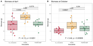 These results suggest a potential beneficial effect of PGPB inoculants on the growth of Sideoats grama. However, it is surprising that the "PGPB + AMF" treatment did not yield better results, showing an insignificant effect compared to no inoculation. This could be due to differences in the formulation of the two products. The PGPB product (BioGenesis III Seed Treatment) is specifically formulated for seed application, which aligns better with our seed pelletization, whereas the "PGPB + AMF" product (Spectrum + Myco) is designed for surface application.