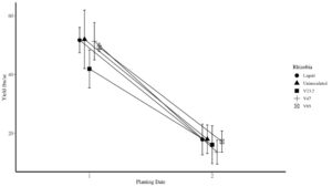 Similar to N fixation, yields were significantly decreased at the later planting date. On average, yields were 49 bu/ac at the on-time planting and just 17 bu/ac at the late planting. Within planting dates, yields were not statistically different between rhizobia inoculants although V23.2 trended lower, which suggests that this particular rhizobia may consume higher amounts of carbon than other rhizobia species (Figure 28). Moreover, this figure highlights the importance of inoculants for conserving soil N. As this figure shows, the uninoculated control yields were comparable to the other rhizobia inoculants. Assuming similar total nitrogen in the plant, the uninoculated control uses significantly more soil-derived N, which would leave less residual N for subsequent crops.