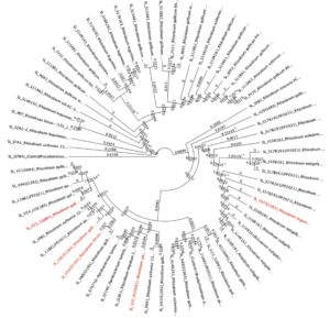 The use of non-rhizobia species, including Bacillus and Pseudomonas strains, as co-inoculants has shown to have beneficial cumulative effects. Non-rhizobial plant growth promoting bacteria has been shown to improve nodulation and grain yield of the legumes upon co-inoculation with crop specific rhizobia (Kohr, 2017). Therefore, these strains will be kept in storage and might provide further use for other researchers investigating co-inoculation effects. Below is a phylogenetic tree constructed from the non-rhizobia extracted isolates from the sample sites.