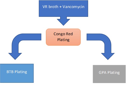 Figure 8. Scheme representation of parallel plating scheme. Bacteria isolates are cultured in VR broth supplemented with vancomycin gram-positive inhibitor. They are then spread on Congo Red plates, and round, convex, and glistening colonies (without significant red color absorption) are spread onto BTB and GPA plates concurrently. Samples that show yellow reactions in BTB plating, but no growth in GPA plating were made into a glycerol stock and used for sequencing.