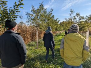 On a beautiful early October morning, agroforestry farmers Mark and Tammy Allen welcomed over 30 local producers, neighbors, and agroforestry-curious people to their farm in Argenta, IL for a farm tour and perennial potluck. Their 10-acre farm features over a dozen different species of perennial fruits and nuts, high tunnel fruit and vegetable production, mushrooms, bees, and a beginning propagation and value-added production business. As we walked the farm, we tasted late-season fruits and vegetables, learned about their innovative multi-species design, and marveled at their solutions to common in-field issues like trunk rub from tree tubes and predation from small mammals. After the walk, participants enjoyed shared dishes on pawpaw cheesecake, apple and honey slaw, roasted chestnuts, fruited drinks, and other dishes featuring perennial produce.