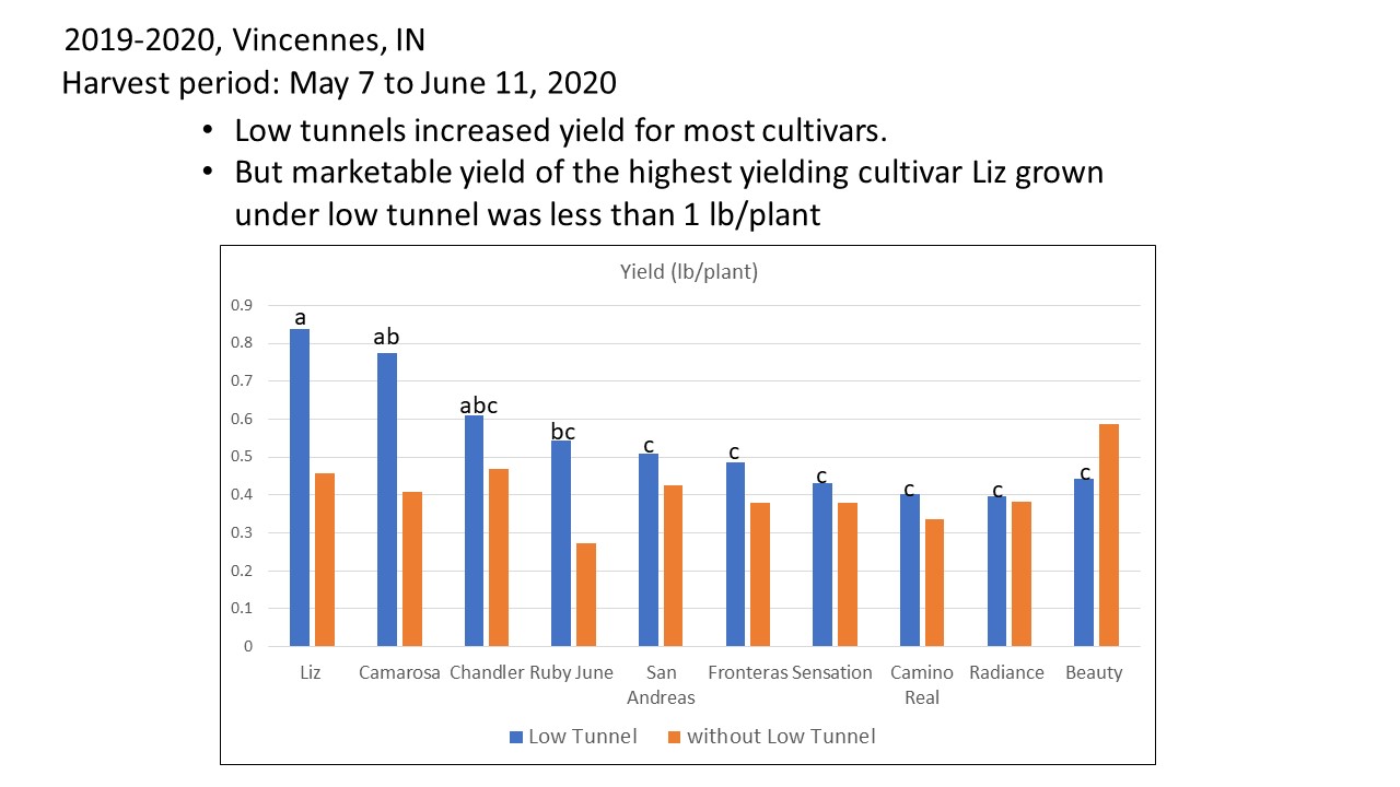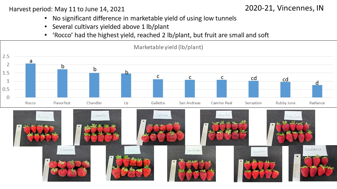 Results for a study evaluating strawberry cultivars in a soil-based high tunnel system were described in the journal article: Strawberry cultivar evaluation for fall-planted high tunnel system. HortTechnology. 32:542-551 DOI: 10.21273/HORTTECH05103-22