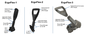 Fig. 1. Ergonomic auxiliary handle prototype family (ErgoFlex and ErgoCore configurations) showing adjustable height, rotational joints, and structural variations designed for long-handled agricultural tools.
