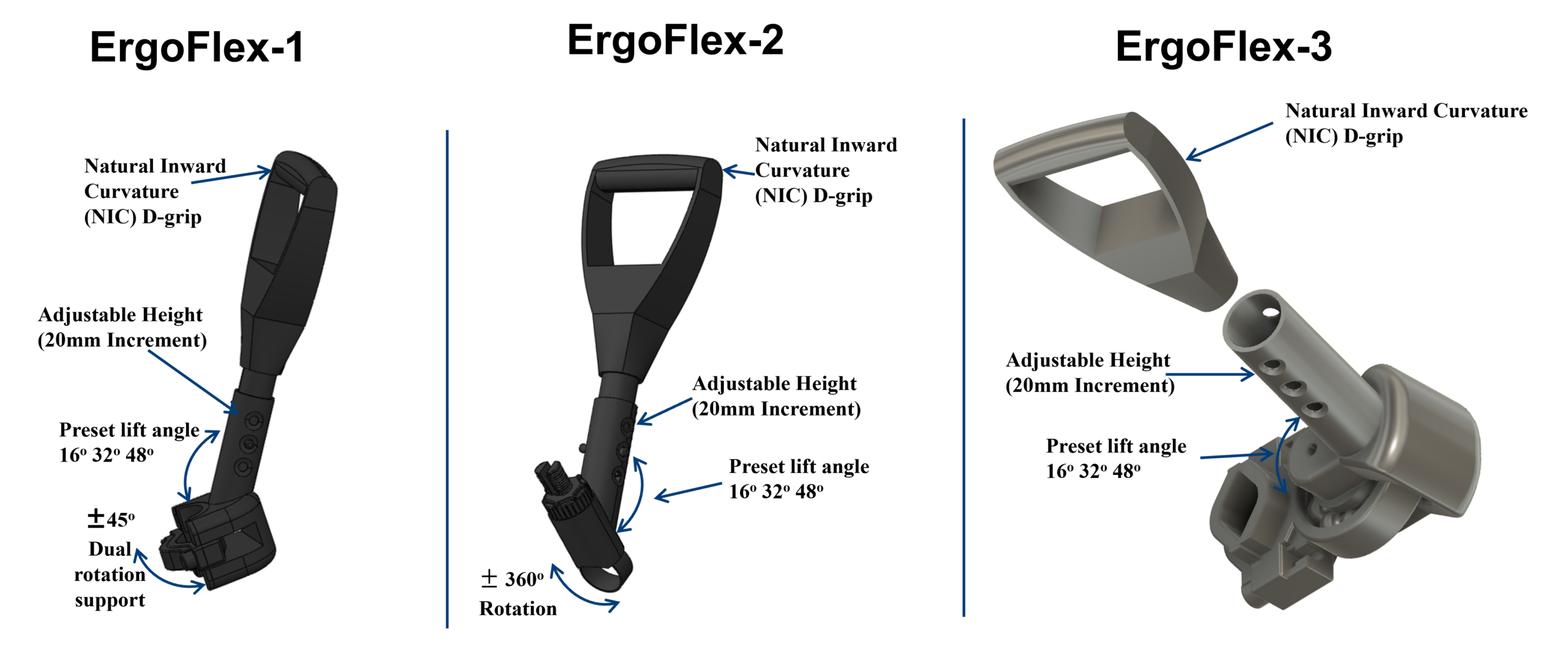 Prototypes featured a Natural Inward Curvature (NIC) D-grip, adjustable height mechanisms, and rotational joints to improve wrist alignment and reduce excessive trunk bending. All designs were developed using CAD modeling and fabricated using 3D printing and reinforced materials for durability.
