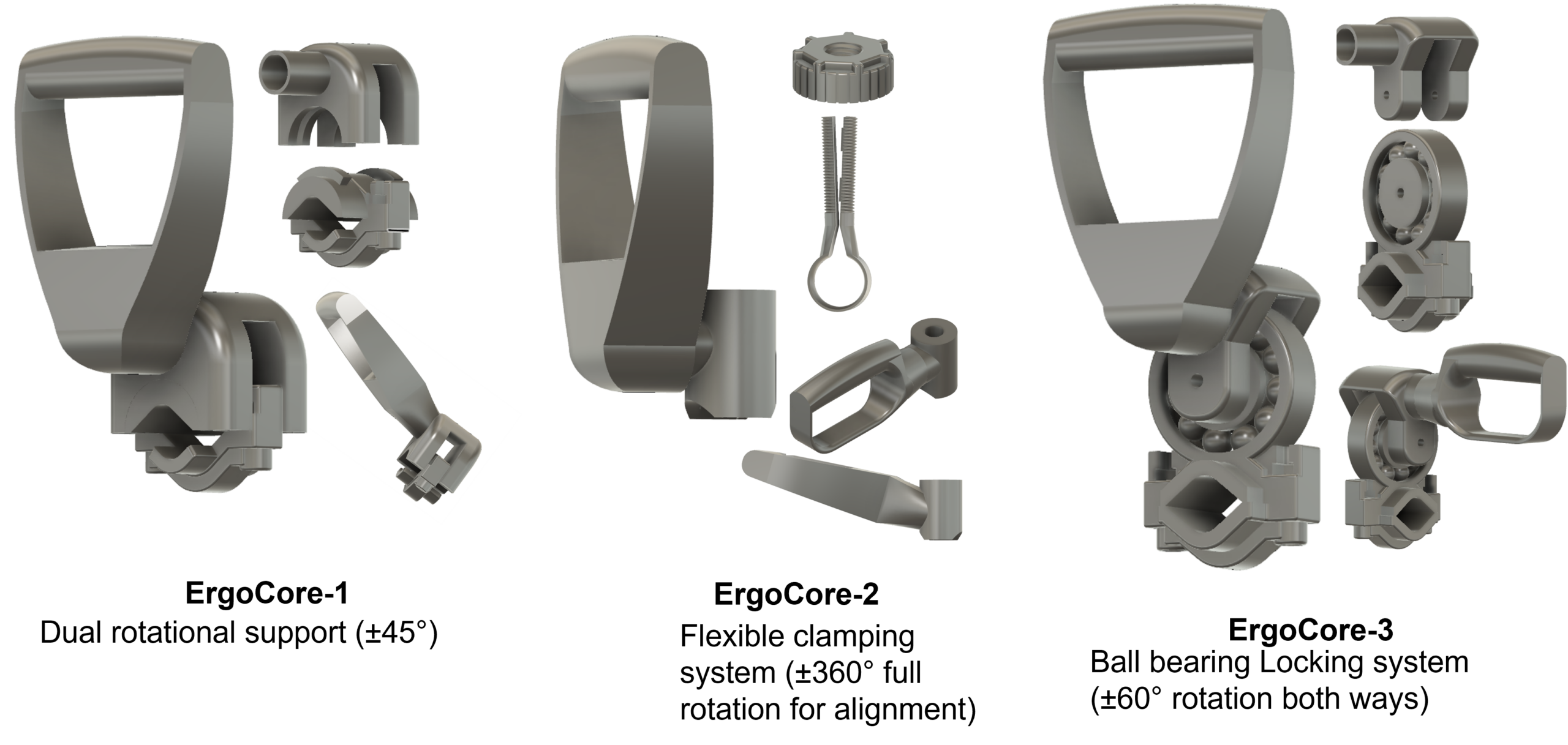 The 2025 auxiliary handle study focused on developing and evaluating ergonomic handle attachments designed using anthropometric and biomechanical principles relevant to women farmers. The prototype family included adjustable (ErgoFlex) and fixed (ErgoCore) configurations, incorporating multiple design concepts such as dual rotational support, flexible clamping, and ball-bearing locking systems. These were tested across different handle angles (16°, 32°, and 90°) to evaluate their influence on posture and workload.