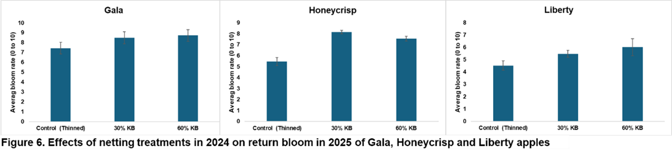 Netting had a significant effect on return bloom of Liberty and Honeycrisp but not Gala (Figure 6). The latter cultivar is annual bearing, thus improvements in return bloom are not necessary; however, Liberty and Honeycrisp are both highly prone to biennial bearing. Because netting reduced the number of pollinated and fertilized flowers, nets produce similar results as bloom thinning on increasing return bloom.