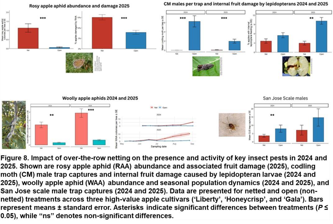 San Jose Scale (SJS): Fewer male SJS were captured in traps in netted trees and no SJS scale was detected on fruit from any netted treatments in 2024. In 2025, we had minor San Jose scale damage ~2%, but it did not show any significant difference between nets and open. In addition, fewer of its natural enemy, the parasitoid Encarsia perniciosi were caught under the nets suggesting the nets may inhibit natural pest suppression.