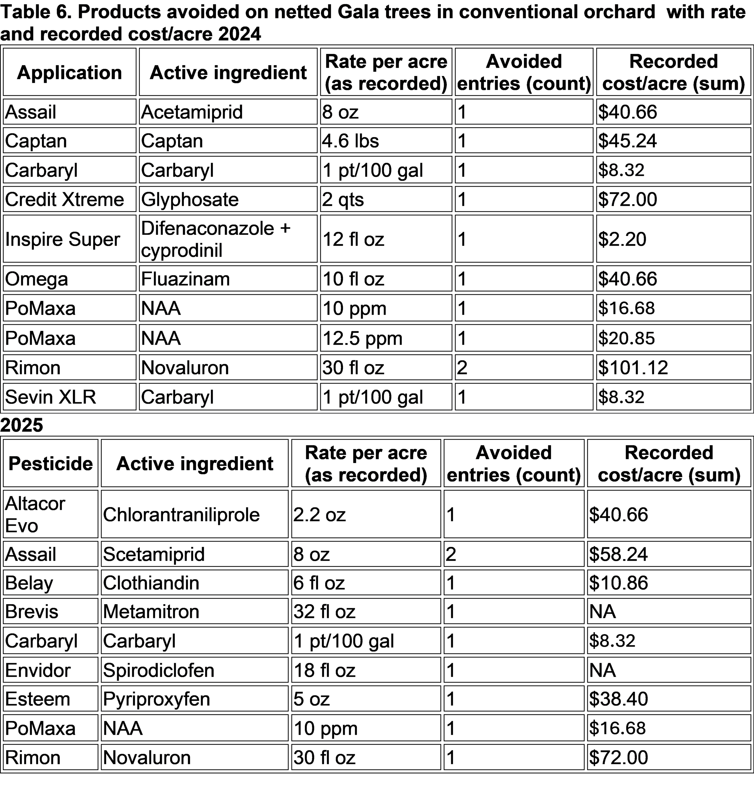 From 2024 and 2025, spray records in Michigan State University: Clarksville Research Center (conventional orchard) show multiple pesticide and thinning-related products that were not applied on “Gala” netted trees. These avoided inputs produced measurable economic and environmental benefits (Tables 5&6):