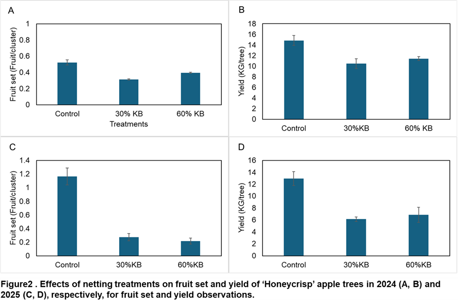 Fruit set and yield responses to over-the-row netting varied by cultivar and season but consistently demonstrated the ability of netting to moderate crop load without causing severe yield penalties (Figures 1–3).