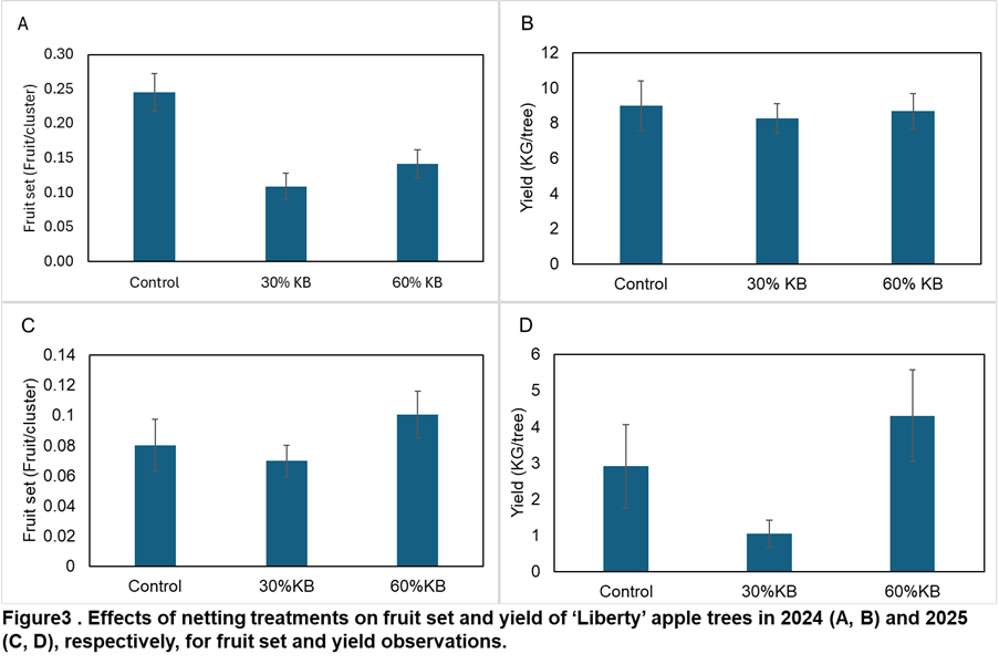 Despite minor reductions in fruit set in ‘Liberty’ and ‘Honeycrisp’, yields across all cultivars were statistically similar between netted and non-netted trees, meeting our productivity objective. Fruit quality met market standards, and vegetative growth showed a favorable response under nets. Netting fully protected marketable yield from hail at two sites, avoiding a ~10% loss in unnetted rows. Pest exclusion was highly effective against codling moth and San Jose scale, eliminating the need for insecticide sprays at two locations. Organic growers reported labor savings (~2 hours/week) by eliminating trap monitoring and reactive sprays. Additionally, netting improved return bloom in ‘Liberty’ and ‘Honeycrisp’, suggesting potential for mitigating biennial bearing.
