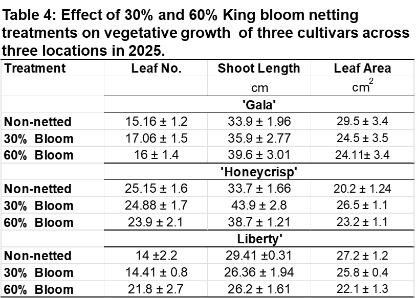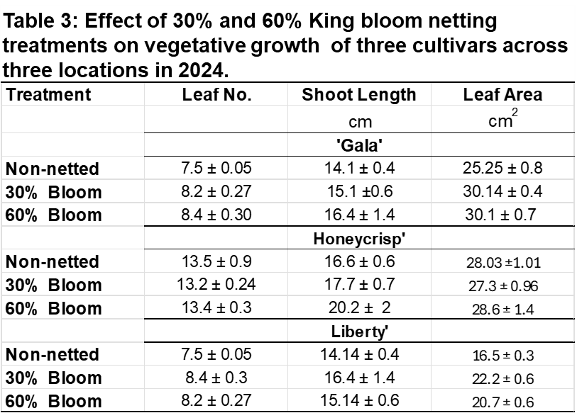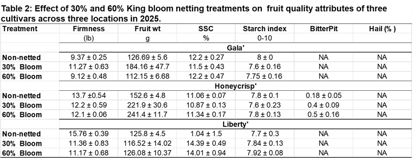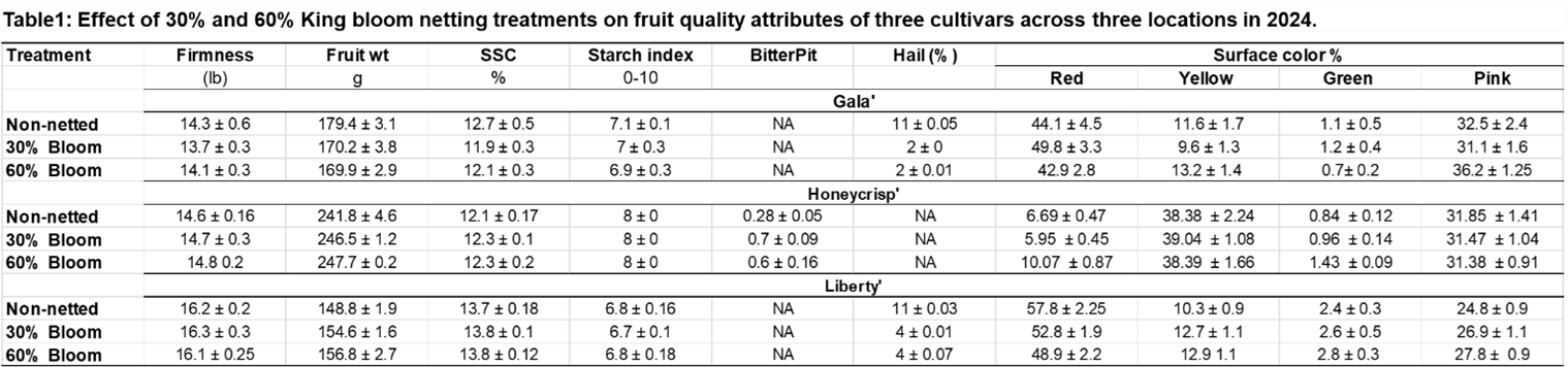Experimental Overview: Three high-value apple cultivars, Liberty’, Honeycrisp’, and ‘Gala’ were evaluated across three sites [two commercial orchards (one organic and one conventional) and one University research center] using insect-exclusion anti-hail netting systems installed at pre-selected, target bloom percentages (30% and 60% of open King Bloom) and compared to a non-netted control. The impact of netting was assessed on fruit set, yield, vegetative growth, leaf physiology, fruit quality, and hail injury.
