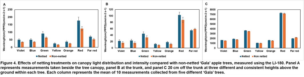Canopy light intensity and spectral distribution were quantified in 2025 using an LI-180 Spectrometer (LI-COR Biosciences, Lincoln, NE, USA) to characterize how over-the-row netting modifies the orchard radiation environment. Measurements were collected at three canopy positions: (A) on the edge of the tree canopy, (B) at the trunk, and (C) at three vertical heights within the canopy. Each bar represents the mean of replicated measurements collected from multiple trees per treatment (Figure 4).