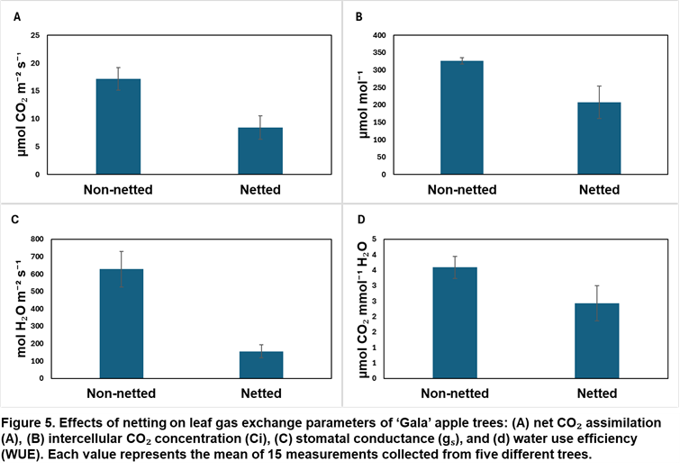 The reduction in stomatal conductance and transpiration under netting is consistent with a moderated canopy microclimate characterized by reduced radiation load and buffered environmental stress. Although carbon assimilation was highly reduced under nets, this did not translate into yield penalties via reduced fruit growth, though in some cases yield was reduced by nets compared to controls. Single leaf gas exchange penalties from netting could have been slightly altered by having greater canopy leaf area.