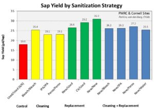 From 2014-2017 we determined the effect of different sanitation strategies (replacement, cleaning, or cleaning plus replacement) on maple sap yield, cost of implementation, and net profit on a per tap basis. The results are quite clear that the highest net profits are typically gained through replacement strategies, that cleaning produces a somewhat lower net profit, and that a combined cleaning plus replacement strategy produces the least net profit. Clearly any type of sanitation strategy was better than no sanitation at all. The various sanitation strategies produced a range of net profits from $0.39-2.33. When cleaning with sanitizers is used, longer contact times are necessary to increase efficacy of microbial kill. In some cases when sap yields are low (gravity collection), some sanitation strategies can result in negative net profits. However, because maple producers may have other reasons for adopting a particular approach, we presented the range of options investigated so that individual producers could make a more informed decision on how different sanitation strategies might affect their bottom line.