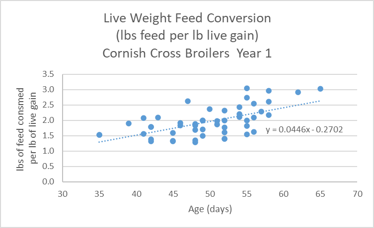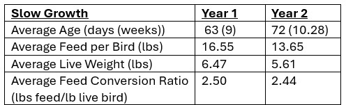 In this study, Cornish cross birds exhibited a more pronounced growth curve in year 1 than in year 2; however, flocks were generally not raised long enough in either year to observe a significant decline in efficiency toward the end of the production cycle. Slow growth birds showed a similar pattern in year 1, but this trend was reversed in year 2, with greater variation in feed conversion by age. This increased variability reflects the use of different breeds in year 2 compared to year 1. Because farmers chose when to process their slow-growth flocks, birds with different genetics were harvested at different end points, altering the well-documented efficiency trends typically observed in commercial production guides. In contrast, Cornish cross birds have a much narrower genetic pool, resulting in trendlines that more closely align with published commercial data. These patterns are reflected in the tables below, which present growth efficiency (pounds of feed per pound of live gain) by age.