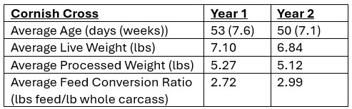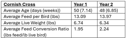 We did not see a significant change in the age of the Cornish crosses from year 1 to year 2, indicating that farmers tended to raise them to a certain age, rather than weight. That said, we do know some individual farmers processed based on weight in year 2 when they had previously processed based on age in year 1. It was noted that the birds in year 2 consumed more feed per bird, were less efficient, and had a lower live weight in year 1. This could have been from a variety of factors, including those impacted by individual farm management differences due to uncontrollable factors during the growing season year over year.
