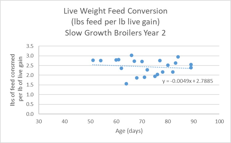 Slow growth broilers were raised longer than their Cornish counterparts, generally to around 10-12 weeks of age instead of 7.5-9 weeks. This additional time for growth is necessary because these breeds are slower at accumulating fleshing and body size than the Cornish crosses. Feed conversion was worse for the slow-growth flocks, which matches what we find in the published literature for commercially raised flocks, even though the average live-weight per bird was similar at their processing dates.