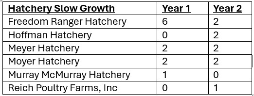 There were fewer hatcheries represented for slow growth broilers, both because we had fewer slow growth flocks on the project and because there are a limited number of hatcheries that offer slow-growth broiler chicks. While many hatcheries offer males of egg-type chicks to raise out for meat, these were not considered as part of the study; only slower growing meat-type chickens were. Within this classification of chickens, there was a bias toward Freedom Ranger Hatchery in part because of name recognition.
