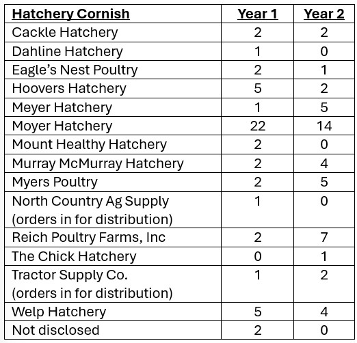 Project farms were not necessarily hatchery loyal. If they had a poor performing batch of chicks, they would switch hatcheries to either switch genetics or order from a hatchery that was closer to reduce the stress on the chicks during shipment. Likewise, if they didn’t like how the birds tolerated their production system once on pasture, they would switch as well. Another factor that strongly influenced hatchery use was chick availability; in the years of the study (2022-2024), there were chick shortages and farmers who didn’t place their orders by late winter were usually not able to get chicks from their hatchery of choice. The bias towards Moyer for Cornish cross chicks is because there was a WNY distributor who ordered in chicks for regional farmers to pick up, reducing the purchase price and shipping stress, which was attractive to many of our producers.