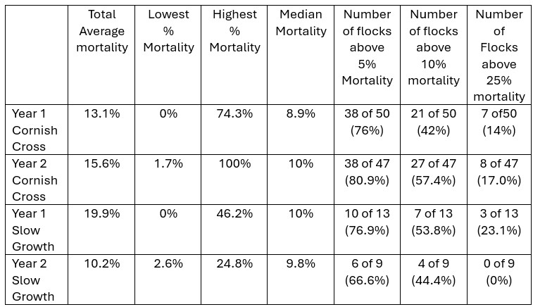 Commercial production guides for Cornish cross list that a 5% mortality rate is too high for conventional production systems (Vencomatic, 2022) and that the target should be no more than 2% (Champrix, 2025). Ideally, mortality in the first week should be less than 1% (Cobb Broiler Management Guide). In our project, median mortality rates were right around 10% for both breeds. What we found startling, however, was the percentage of individual flocks with mortality numbers higher than 10% (42% - 57.4% of flocks) and higher than 25% (0% - 23% of flocks). There was no obvious difference between the mortality rates by year for Cornish cross and slow growth broilers. The chart below outlines the average mortality losses for the two varieties of broilers by year. It shares this information in more detail in addition to mean, median, and the range of mortality rates that our project flocks experienced.