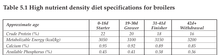 This snip of a chart is from Poultry Nutrition, 3rd edition. It outlines the crude protein needs for Cornish cross chicks from 0-18 days, 19-30 days, 31-41 days, and over 42 days.