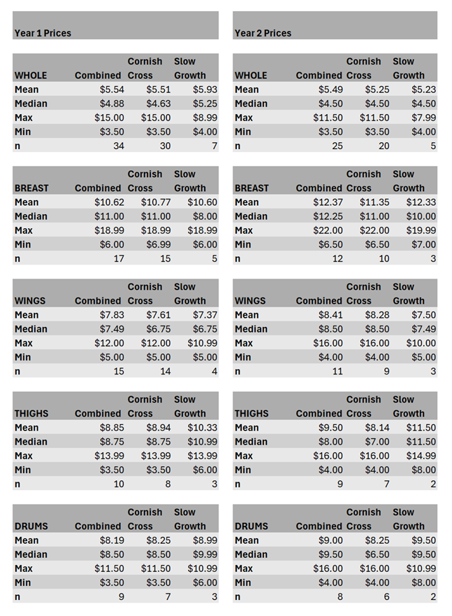 Participating farms tracked detailed financial data for their broiler enterprises, including direct costs (such as feed and chicks), indirect costs (including depreciation of freezers and processing equipment), and other expenses such as labor, mileage, and marketing fees. At the end of each year, farmers individually evaluated their production and business practices with educators from our project team, and made adjustments aimed at improving profitability in the following season. In addition to gaining a clearer understanding of their own costs of production, farmers were able to compare their enterprise performance to statewide performance and profitability benchmarks, which were calculated from each cohort's averaged data in year 1 and year 2.