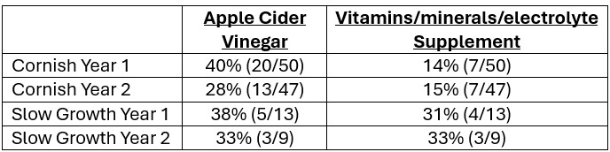 Preventative measures to improve resilience and performance of broilers under stressful conditions included providing feed additives such as apple cider vinegar and vitamins/minerals/electrolytes in the water. Apple cider vinegar provided at a rate of about 1-2 tablespoons per gallon continuously acts as a gut acidifier, improving performance and increasing immune strength (Jahantigh et al., 2020) (Adeleye et al., 2021). It performs best when provided regularly vs for a short period. Vitamins/minerals/electrolytes, on the other hand, can be placed in the water for a few days prior to and following stress events (shipping, movement onto pasture, heat stress, or cold stress) to improve the immune response to these events, decreasing the severity of production depressions resulting from them. We did not have enough complete data sets from producers using vitamins/minerals/electrolytes consistently to compare those who used them to those who did not. The table below shows the percentage and number of flocks using apple cider vinegar and supplements of vitamins, minerals, and/or electrolytes.
