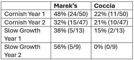 The table below shows the percentage and (number of total flocks) where chicks were given vaccines for Marek's and coccidiosis in year 1 and year 2.