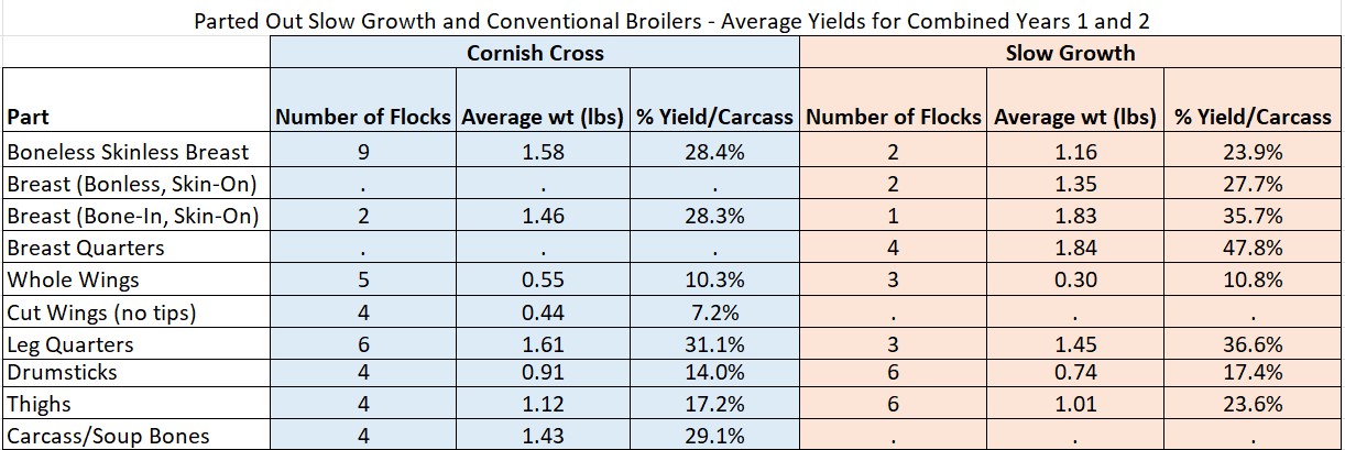 - Year 2: 47 Cornish flocks (4,487 birds), 11 slow growth flocks (1,344 birds). Slow growth breeds consisted of Royal Grey Broilers, Royal Red Broilers, Red Broilers, Freedom Ranger Broilers, and Red Jackies.