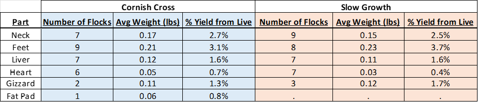 On processing day, final live weights were collected on the banded birds, and those birds' carcass weights, without necks or giblets, were be taken. Farmers had the choice to part the project birds out into standard retail cuts (breasts, thighs, legs, wings, necks, feet, soup bones, and organ meats). If farmers did not know how to cut whole carcasses into value-added cuts, their educator taught them how to accomplish this as well as weigh the individual parts to calculate their percentage of the whole carcass. There were a significant portion of farmers that didn't have experience processing their own chickens, and these skills were taught by their assigned educator as well.