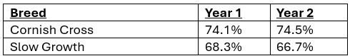 The two charts below show average age, feed consumption, live weights, and feed conversion ratios for Cornish cross and slow growth broilers from year 1 and year 2.