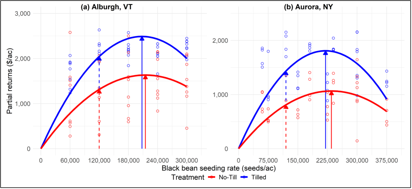 Black Bean Seeding Rates: Higher seeding rates (greater than 200,000 seeds/ac in both no-till and tillage systems) compensated for reduced emergence and stand loss and resulted in the highest partial returns. Increased plant densities improve weed suppression and increase yield, with relatively high price premiums for organic black beans justifying greater investment in seed cost to ensure top yields. Overall, both yields and maximum partial returns were lower in the no-till system.