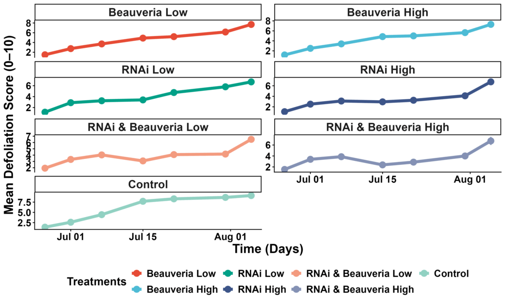 Foliar damage provided the clearest evidence of treatment effects. In the full model, several treatments showed significantly lower defoliation than the Control. Defoliation in the Control averaged ~6.0 on the 0–10 scale, compared with 3.4–4.6 in fungal, RNAi, and combined treatments. The two-date model revealed strong date effects (P < 0.001) and several significant treatment × date interactions: by mid- and late-season, RNAi High, RNAi+Beauveria Low, and RNAi+Beauveria High all produced significantly lower defoliation compared with Control (Tukey-adjusted P < 0.05). These reductions were most pronounced on July 15 and July 31, when Control plots showed the steepest increase in leaf injury. Treatments involving Beauveria alone (High or Low) showed moderate but non-significant reductions relative to Control (Figure 6).