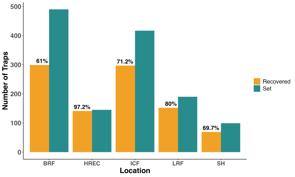 To strengthen our understanding of wireworm communities and improve the design of future fungal efficacy trials, we expanded our trapping effort across five locations (Bare Root Farm (BRF), UVM Horticultural Research and Education Center (HREC), Intervale Community Farm (ICF), Last Resort Farm (LRF), and Shelburne Farm (SH)) throughout the growing season. Across sites, we deployed over 1,500 baited traps, with recovery rates ranging from approximately 60% to 97%, depending on location (Figure 9). These traps were set repeatedly from April through October to capture seasonal activity patterns.