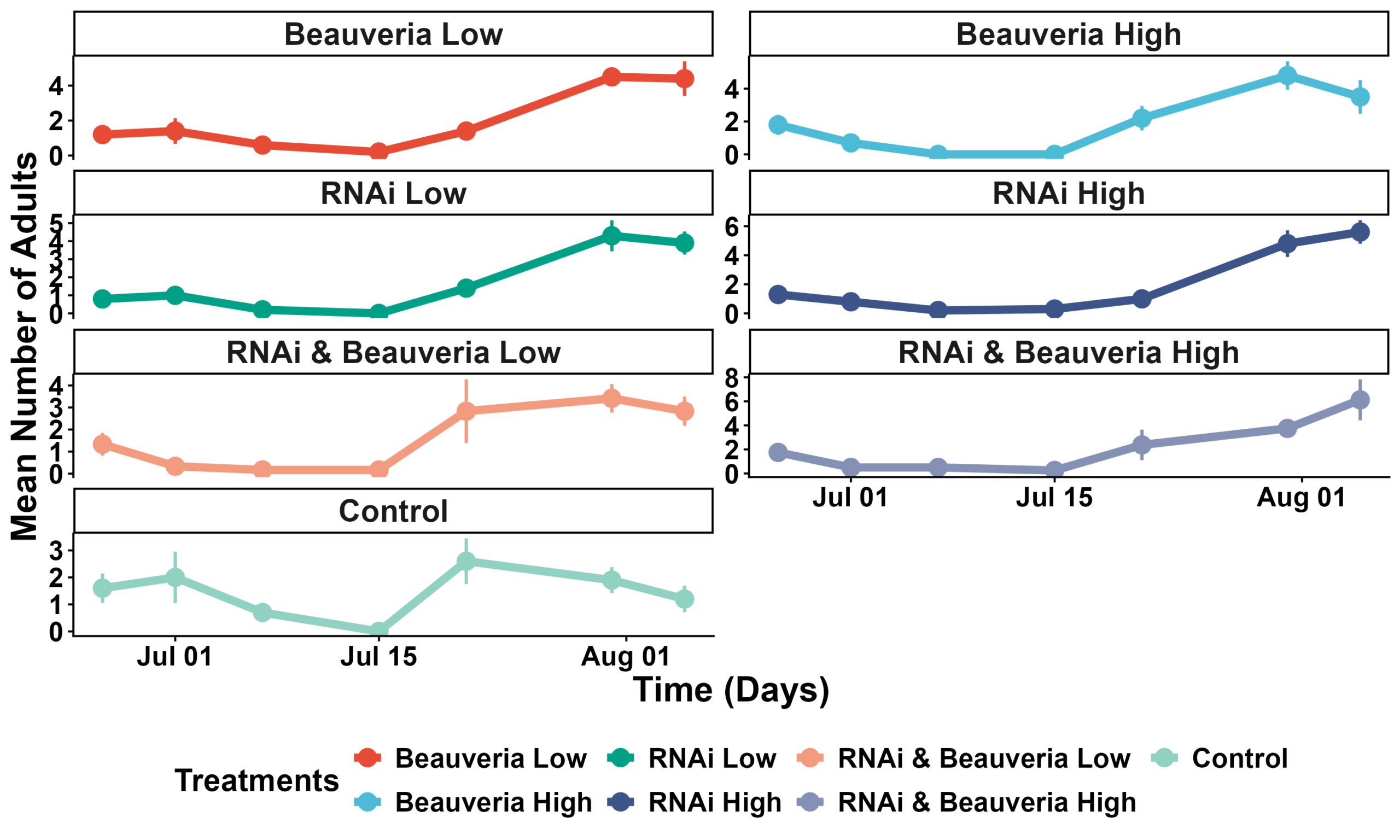 Figure 5. Adult Colorado potato beetle counts over time for each treatment. Mean adult abundance (± SE) across the growing season.