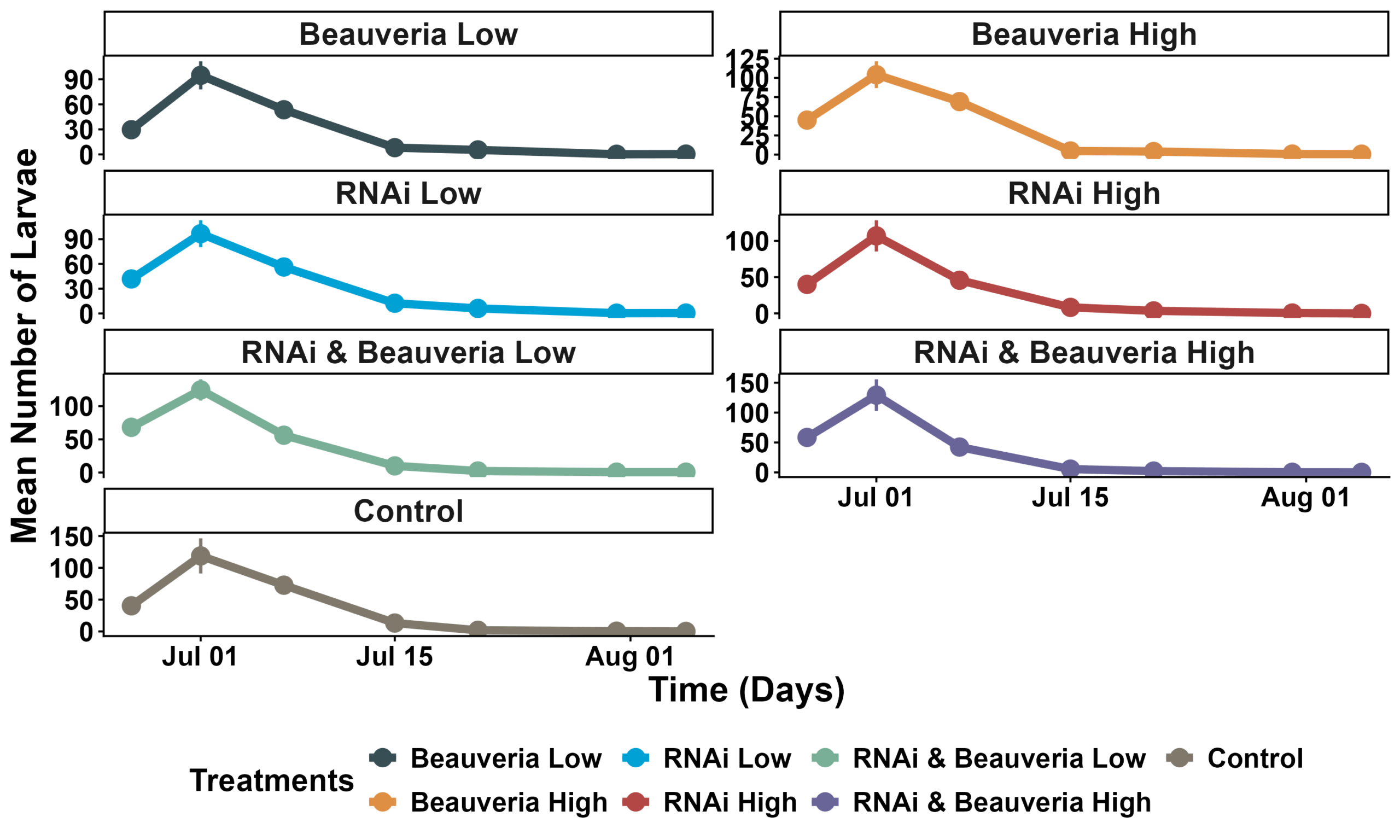 Figure 4. Mean larval abundance across treatments. Mean number of larvae (± SE) per plant from late June through early August at HREC.